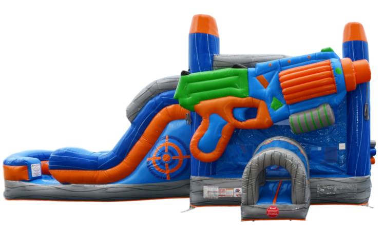 Bring high-energy fun to any party with the Battle Blaster Combo Double Lane — a bold, inflatable combo unit designed for nonstop action. This eye-catching setup features a roomy bounce area for active play, an entry with a tunnel crawl, climbing steps, and a double flume slide so two racers can splash down side-by-side. Bright blue, orange, green, and gray colors and a giant blaster graphic give it a playful, game-like theme that draws kids in and sparks friendly competition. Built for groups, it keeps jumpers moving with a mix of bouncing, crawling, climbing, and sliding, making it perfect for birthday parties, team events, or neighborhood gatherings where children want fast-paced, social fun. Easy to see and supervise from outside, it offers a lively focal point that encourages safe, energetic play under adult supervision.